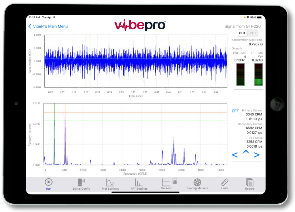 The heart of predictive maintenance is a good vibration monitoring app, backed by reliable vibration analysis equipment. Combined with our other predictive tools, the new VibePro 10 app provides an affordable alternative to the current offering of vibration equipment and tools on the market. Route data collection, onsite analysis and remote web-based vibration data analysis make this a powerful solution for any reliability maintenance program. VibePro 10 combines the tools and simplicity of previous VibePro versions with the flexibility of live data collection and more in-depth analysis markers.